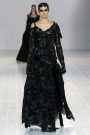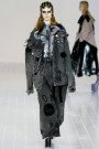 Marc Jacobs showed his extravaganza of fashion-noir on a stark white set to the sound of single chimed notes by Japanese musician Keiji Haino. Darkness ruled, but with an underlying sweetness. The models’ eyes and lips were black. The clothes were dark, wondrous, inventive, eccentric pilings of tweeds, furs, silks, and endless decoration, Victoriana meets Goth meets Biker Chic meets Varsity Chic meets Red Carpet meets Violet Incredible and countless other girls of Jacobs’ runways past. Cats, rats, cherubs and ballerinas got acquainted on prints, a giant raven took up residence on the back of a jacket and a lady named Gaga walked the show.