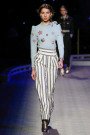 Micheal Kors’ show was all about function made special and chic — coats (and more coats), sweaters, pants and skirts. How everyday can it be? Kors opened with the basics — peacoat, white blouse, pullover and jeans, but the jeans happened to be feathered from the knees down. Camel made it onto the runway in a shawl-collared coat — a floral mink, worn over a sweater and cropped pant. Other coats got abundant fur collars or were cut in glistening floral brocades. An officer’s coat was sashed in mink. Another simple pleasure, knitted cashmere, came in a charcoal sweater-and-skirt duet that got the reality diva treatment with feathers. Kors kept his shapes from classic to retro.