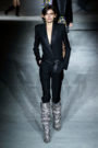 Next fall the glamazons of Balmain will be dressed in raw pelts with a stitched-together feel. One of the models looked particularly fierce in a black dress assembled from crocodile skins, a tribal-looking metallic lip ring tracing a gleaming line across her mouth. Other options included a shearling sleeveless coat, or a tunic top pieced together from panels of glossy ponyskin. “It’s all about a return to the forces of nature. I wanted to create strong Amazons. Women’s power today is extremely important, and I think I reflect that with this collection. It’s very feminist,” Olivier Rousteing told WWD backstage.
