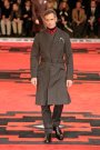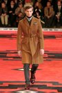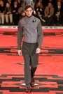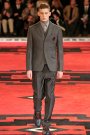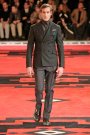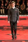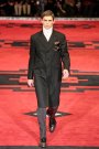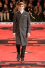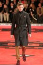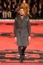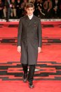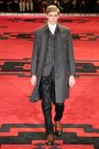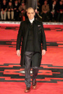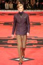 Dressed in severe coats reminding of Eastern Bloc military dress, the models and actors Willem Dafoe, Tim Roth, Adrien Brody and Gary Oldman walked a massive, carpeted space. The first outfit set a military tone: a smart dark coat over a white turtleneck, slim pants and gleaming dress shoes. Belted coats in lightweight wool played a major part and they were often decorated with badges over the heart. Colors were of course a bit off beat, mustard, purple, grey and black – and the fabrics looked vintage.