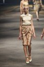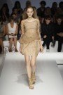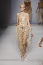 Roberto Rimondi and Tommaso Aquilano only used four different shades to design their SS2010 collection, their third for Gianfranco Ferré. Their short party-dresses and feminine tuxedo-looking suits were all shown in white, ivory, gold or black. By using only these colors the designers lived up to Ferré’s idea that the color of a design is inferior to its shape. A great deal of the dresses were one-shoulder-pieces which had a round shape from the waist down and were worn above the knee. They were made out of transparent wavy fabrics and therefore showed some resemblence to the crimped hair of the models. In some of the designs shoulder pads were used. Most of the looks were finished off with very thin metallic belts, big bracelets and partly open shoes with high metal stiletto heels. The fashion show ended with some theatrical dresses on which transparant veils were attached.(Tess van Daelen)