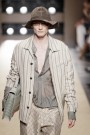 For summer 2011 Tommaso Aquilano and Roberto Rimondi used a soft color palette with hues of beige, light blue and gray. Light stripes and graphic zigzag prints were added to several looks.