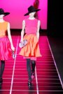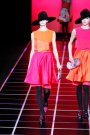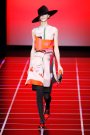 Giorgio Armani called his fall-collection ‘Easy Chic’. The refined tailoring stood for chic, the flat shoes for ease. The clothes pointed to menswear, but were designed with a light hand. Every outfit was topped off by a fedora, and vibrant orange and fuchsia ran throughout. Armani opened with sleek gray combinations and suits with tops in solid colors or graphic prints. He then moved to light pieces over  man-tailored shorts. Skirts were cut for ease of movement. The mix of all kinds of  textures and weights kept it interesting.