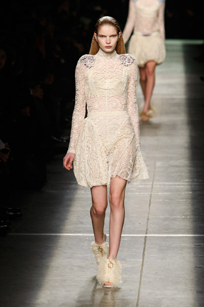 In Riccardo Tisci’s collection for Givenchy his graphic prints were perfection. He started the show with triangular shapes and cut-outs and horizontal lines. Halfway the collection the audience was blown away when he introduced his print for spring 2010. It had zigzag patterns combined with lines and curves. Tisci used it in many of his designs and showed it in three different natural shades. Even some shoes with platform wedges had the detailed print all over them. Apart from the graphic print some of Tisci’s highlights were a few great drop-crotch harem pants, multi-layered skirts, loose-fitting sleeves and dresses with ruffles in all the right places. He also gave the shoulders some extra attention by adorning and raising them. Puffy collars were worn on top of Roman draped ultra-light dresses. It’s for sure that this Givenchy collection will do well in stores. So we will certainly see its graphic prints passing by next spring. (Tess van Daelen)