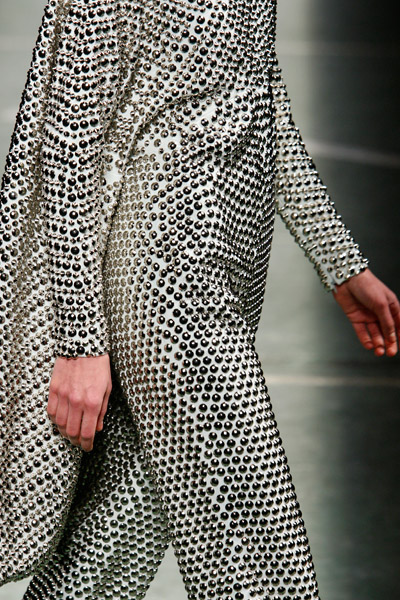 Even when he’s designing haute couture Riccardo Tisci moves between strict-chic and otherworldly, goddesslike creatures living in his fantasyworld. This season it looked like mix of Morocco, Berber tribes-people and other Middle Eastern influences. The silhouette was tailored with padded shoulders and focus at the waist, fabrics moved from velvet to leather and golden embroidery. There were hoods and veils, corsets and drapes – and it all looked very modern.