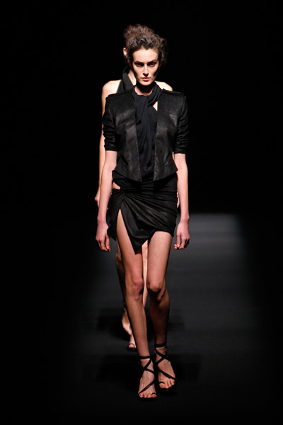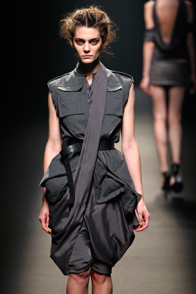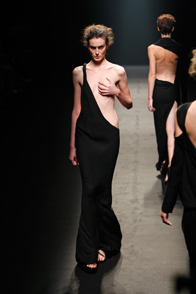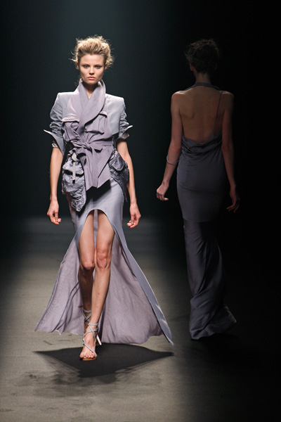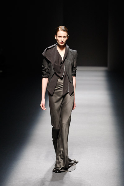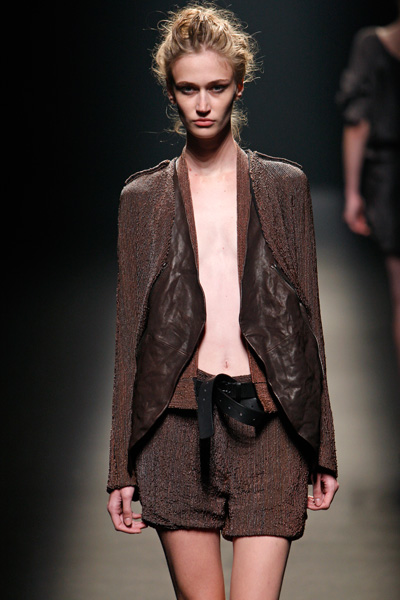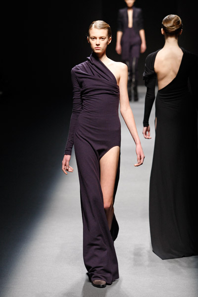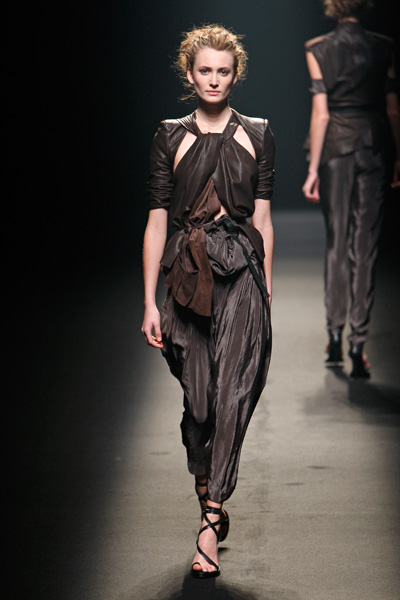 Ackermann toughened up his collection with stiffer fabrics – wool, leather – and added softness with silk and satin for tops and cutout, buttersoft leather for long dresses. Main colors were brown, black and (silver)gray.