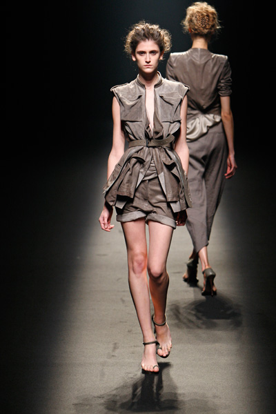 Haider Ackermann had a full house for his excellent show. The atmosphere – excitement, music and collection – caused emotional shivers. The collection was all in monochromatic gray, black and saffron yellow. Ackermann played with textures and gave his clothes a slight toughness with the use of leather and raw fabrics, but the cutting was more confident and sexy. The new key piece is the sleeveless, vaguely military jacket in leather or suede worn with blousy, rolled shorts.
