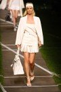 Jean Paul Gaultier took us to the tennis club, where he presented more than fifty hot new Hermès looks. The catwalk had white lines on it and the girls all wore headbands in colors matching their outfits. In some of the clothes (short white, beige or lavender skirts, shorts, polo’s and cardigans) the girls could actually play a good game of tennis. The rest of the outfits (long halterdresses, trouser suits and chiffon tops) were perfect for chilling along the sideline. Though the clothes were very diverse Gaultier showed a cohesive collection of classic/sporty pieces. He used classic color-combinations of red, white and navy-blue. Great leather pieces came in beautiful chestnut brown. The models wore big bangles (colored or silver) and fingerless gloves. They carried small clutches and the famous Birkin bags. One of them even had a tennis-touch to it with a long band, a special part to put the tennisballs in. (Tess van Daelen)