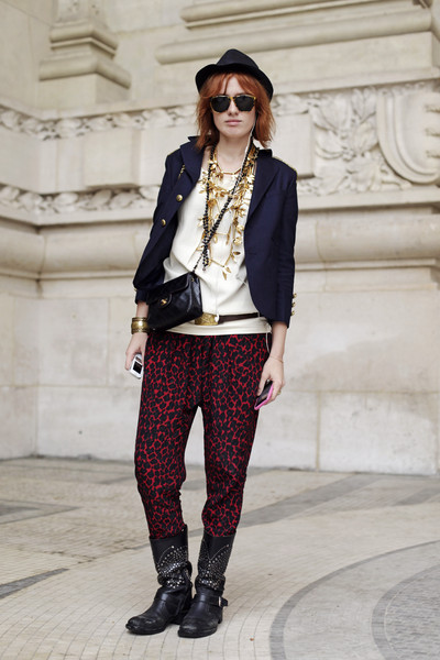 Anna dello Russo worked a golden dress that could just have walked out of the Gianfranco Ferre show. The lollipop pink she chose for another dress was Lindsay Lohna’s color-choice for Ungaro too. The red leopard print Dolce & Gabbana introduced, was seen on a pair of streetstyle pants. And of course the style of a tweed Chanel suit can always be seen on a chic lady somewhere in the streets.