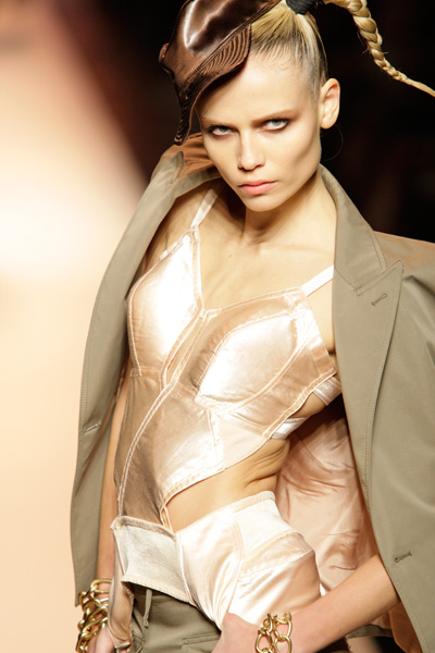 For season ss2010 a lot of attention went out to underwear and lingerie. Many designers used lingerie-influences in their collections. Sometimes underwear was even presented as fully-fledged clothing. Especially at Dolce & Gabbana and Jean Paul Gaultier lingerie played a big part. The Dolce & Gabbana fashion show ended with all the models on stage wearing sexy, vintage-like lingerie with animal and floral prints. As the inventor of the famous cone-bra, Jean Paul Gaultier could not stay behind in this lingerie-trend. He used cone-bra details in many of his designs. Marc Jacobs let one of his models wear silky lingerie on top of her regular clothes. At Dior lingerie was combined with airy nightwear. Many models wore corsets in which their breasts were highly accentuated. Most of the time they were worn with sexy skirts, but they were also manufactered in some dresses. The corsets were made of silk or transparent fabrics, adorned with bows, laces and ruffles. Karl Lagerfield decorated them with pieces of leather that reflected the bright spotlights as if they were made out of metal. (Tess van Daelen)