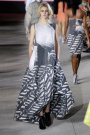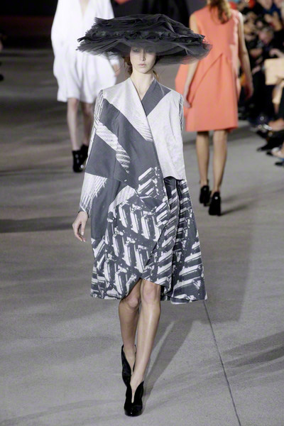 The theatrical romance of the labels´founders was absent, yet the enormous hats of layered tulle reminded us we were indeed attending a Galliano show. Bill Gaytten sobered things up for the brand as he sent crispy clean oversize garments out on the runway. Endless fabrics were tossed, turned and folded (again the origami references) into elegant evening gowns in white, salmon, black and blue. Next to the mono colored pieces he introduced prints (and not the most subtle ones). City-inspired prints of hundreds of cars in standstill traffic slightly disturbed the ladylike feeling of the collection. Yet they did make the designs appear slightly more youthful and modern. Fascinated by the structured stiffness of Gayttens creations we open mouthedly watched the (mostly) A-line shaped creations come and go. How we would love to strut around in one of those blue maxi pants for one day.