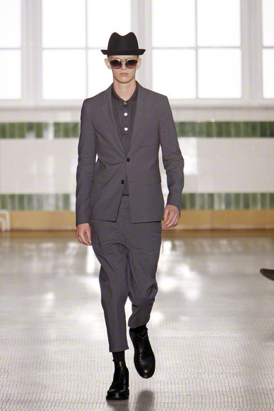 Kris van Assche’s spring summer collection for 2012 is build around the new suit, with wider pants and jackets. They all came with heavy-soled boots, mirrored shades and hats, adding a punkish touch to the uniformity. Van Assche kept his favorite color palette: white, black, beige and shades of gray, with flashes of red in printed shirts.