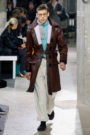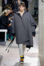 Outerwear had an artistic bent, as in a big black cape that looked as if it had been molded from paper mache while a black leather jacket that was inset, Matisse-like, with triangular bits of blue. The plaid on a duffle coat went every which way, as if the pattern had been shattered — and later reassembled. Knits were interesting, too, with many of them truncated at the waist to reveal more plaid shirts. Trousers veered between the slim and the oversized, with chinos pre-wrinkled with big cuffs.