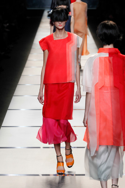 No. 21’s tropical spring outfits, show layered street wear with ornate embroidered gauzes in an edgy arty-crafty spirit. The exceptional work of the couture fur ateliers of Fendi delivered a collection boosting with streamlined modernity inspired by the ‘light and lightness’. Careful bits and pieces of preciously crafted, exceptional materials are artfully clustered. At Just Cavalli one seemed to have bumped into London punks during an inspirational trip to Bhutan. Digital prints, animals spots and handkerchief patterns, all Cavalli icons, where mixed in an iconoclast mix.