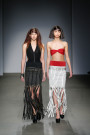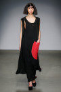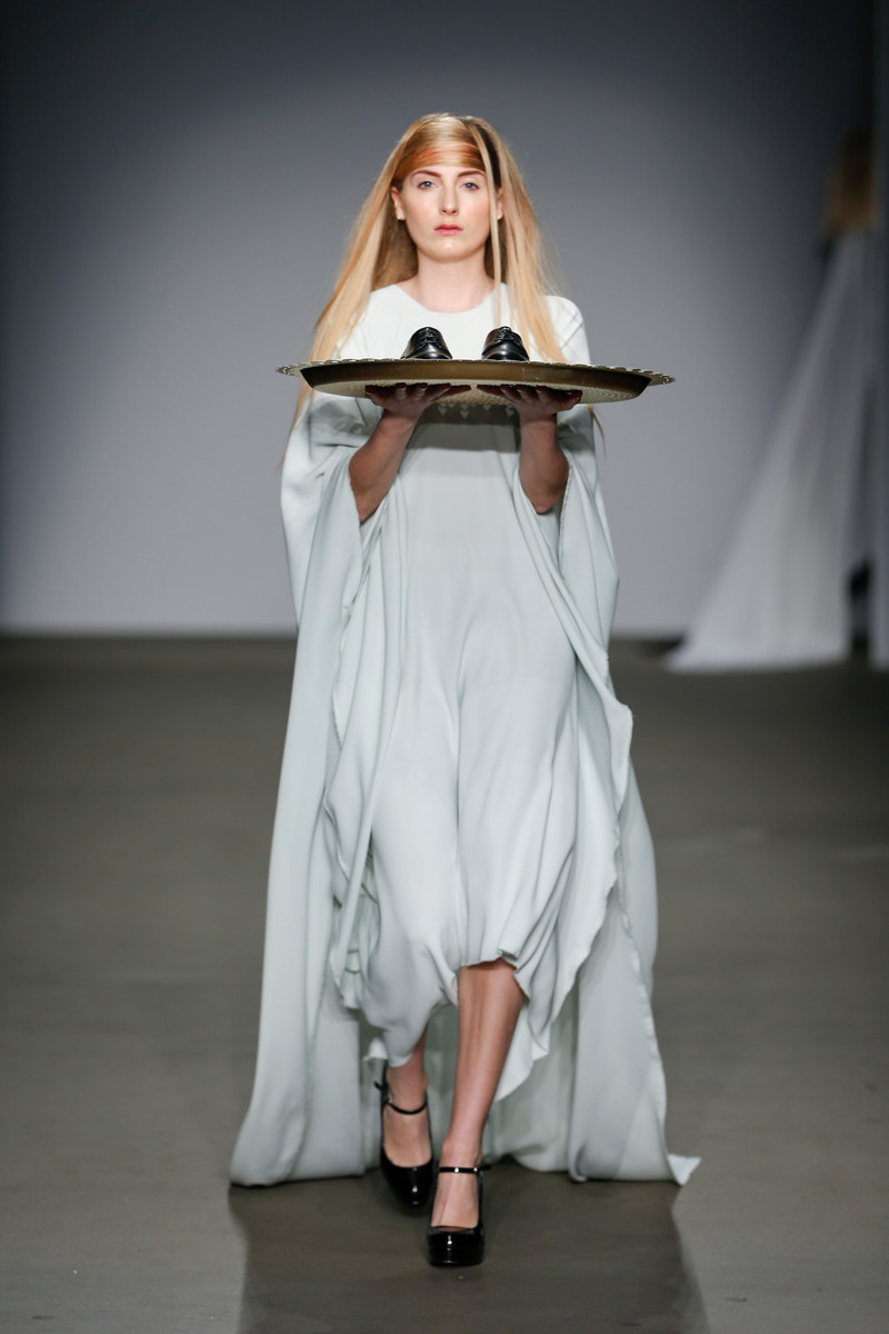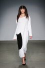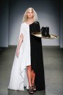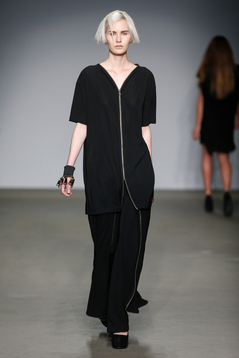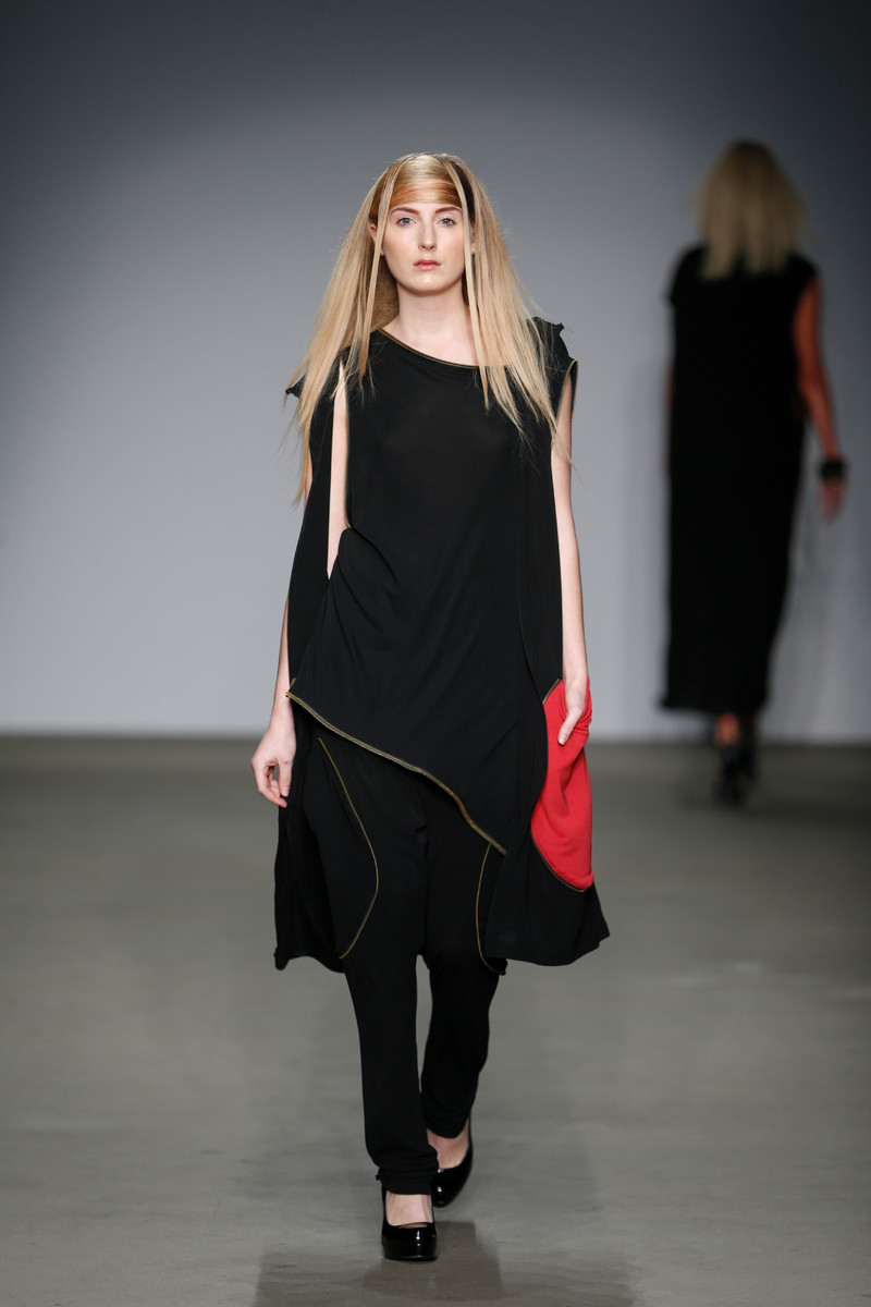 Maison Laponte kicked off the morning of the final MBFWA day. The Italian label presented a simplistic yet feminine collection of mostly duo colored designs. Long tops worn over maxi skirts and floor sweeping dresses in touches of red, white and black. Viscose, known for it’s ability to absorb moisture and contain warmth, was designer’s Gianandrea Sergi’s main choice of winter fabric. The zipper played a big part in this collection (not the first time this fashion week), forming the lining on sleeves and collars. No accessories, but a bunch of zipper decorated bracelets and some extra pairs of shoes, presented on a golden platter. A joyful start of the week and an special experience for the young Italian designer. Gianandrea was excited, we could tell.