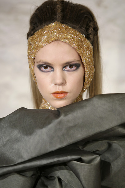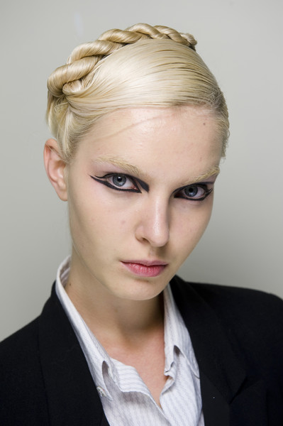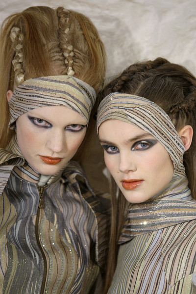 The models’ eyes were painted in every color of the rainbow. At Dior they were purple, blue and green. At Fahri they came in a pastel green and purple combination. Galliano’s girls had pink eyes. Luella Bartley gave her models a thick layer of blue eye shadow, which even crossed their eyebrows.