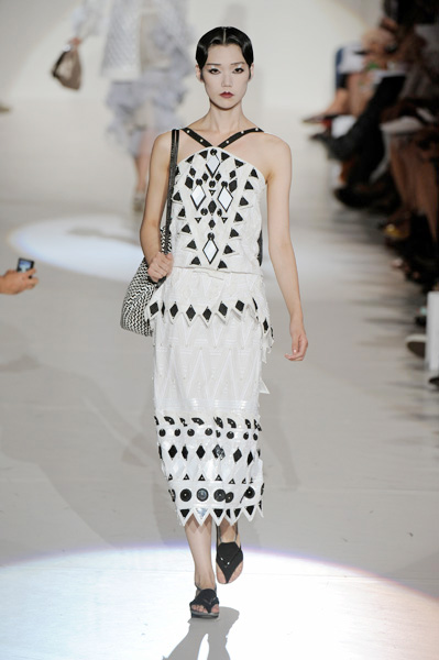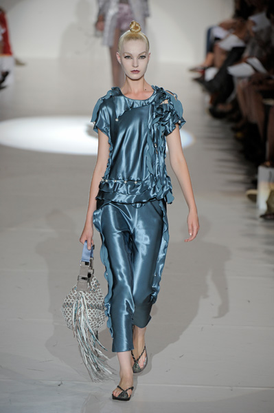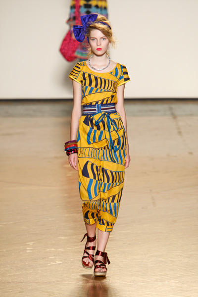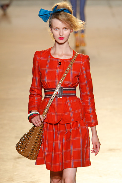 The Marc by Marc Jacobs line he presented for Spring was one of his liveliest in a while. Maybe it’s because Marc Jacobs borrowed some of the details from his own recent oeuvre. To start with, the models all wore bunny bows in their hair, like Madonna’s Vuitton getup at the Met Ball, but in a smaller version. Then there were the jackets and coats with the still-directional forties-by-way-of-the-eighties shoulders. Fall’s neons reappeared as well. But not everything was taken from Jacobs’ previous collections. The African-inspired prints he used for easy, belted day dresses played into New York’s tribal trend. And Jacobs also showed a lot of jumpsuits—the cutest in sporty blue. How daring.