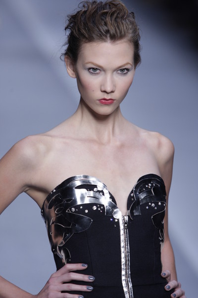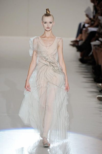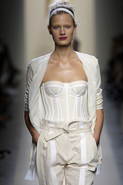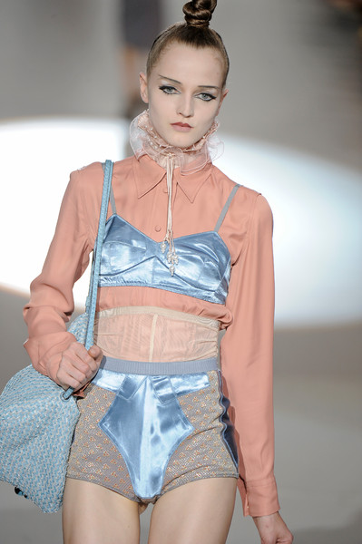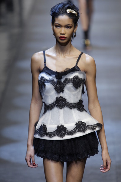 For season ss2010 a lot of attention went out to underwear and lingerie. Many designers used lingerie-influences in their collections. Sometimes underwear was even presented as fully-fledged clothing. Especially at Dolce & Gabbana and Jean Paul Gaultier lingerie played a big part. The Dolce & Gabbana fashion show ended with all the models on stage wearing sexy, vintage-like lingerie with animal and floral prints. As the inventor of the famous cone-bra, Jean Paul Gaultier could not stay behind in this lingerie-trend. He used cone-bra details in many of his designs. Marc Jacobs let one of his models wear silky lingerie on top of her regular clothes. At Dior lingerie was combined with airy nightwear. Many models wore corsets in which their breasts were highly accentuated. Most of the time they were worn with sexy skirts, but they were also manufactered in some dresses. The corsets were made of silk or transparent fabrics, adorned with bows, laces and ruffles. Karl Lagerfield decorated them with pieces of leather that reflected the bright spotlights as if they were made out of metal. (Tess van Daelen)