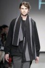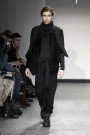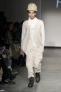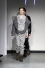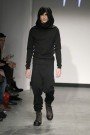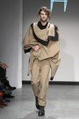 For this show it was American criminal Black Bart that inspired her. She takes us back to 1877, when he was one of the most famous robbers in America. Black Bart was familiar for the notes he left after every robbery. But is was especially his style of clothes that got her. Because no matter what, he was always dressed properly, wearing a three- piece suit and a bowler hat. But to keep anonymous he always wore something under his bowler that covered his face. And that she translated in some extravagant headpieces, like a blouse worn as a huge scarf covering a models face or a huge collar raised until the eyebrows. We also saw the classic menswear suit, but in a rough way. Like a leather pea coat or a denim blouse. And you must have noticed there were real man walking down the runway, among which Ferry van der Nat. ‘Yes, I used older men as models, because they have this typical faces which suits so well with the story.’