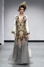We saw some long, silk dresses in soft colors like white, pale blue and salmon combined with wooden keen-edged constructions and revised with embroidered details. A faux fur skirt had knitted flowers on both sides. And the shoes, made of Lego that made the models cradle sometimes, screamed structure.