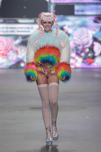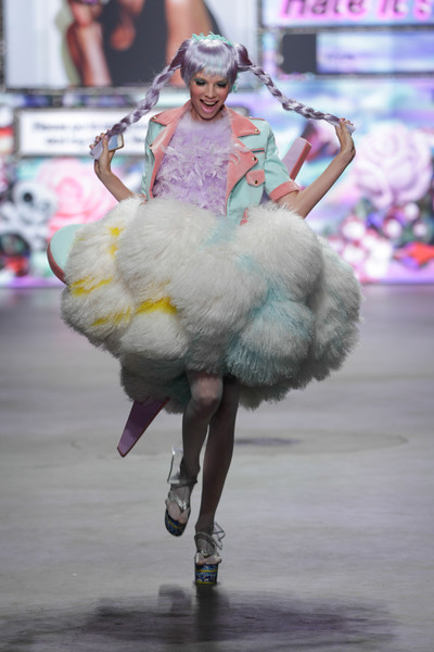 We have to miss Bas Kosters’ spectacle fashion shows this season, but tonight’s MaryMe-JimmyPaul collection was a nice surprising alternative. The designers presented an interactive show as the closing act of this Amsterdam Fashion Week opening night. Sponsored by Vodafone so phones were included in the interactive part. The audience was able to live vote for the looks while they were going down the runway. Doll-like dressed up models with pastel shades wigs and heavy make-up playfully walked the catwalk. They were dressed to the extreme sporting high heels, knee high boots, printed suits and spectacular fluffy/fur-like dresses and tops. With every look the outfits became more colorful, platform shoes got higher and the audience wilder. After the last look; the most hated and most loved models re-appeared. The finale for sure put a smile on everyone’s face when ‘ the designers’ were brought on stage and turned out to be two very tanned, strong bodybuilders in bikini. Bas Kosters too gave his sign of approval by enthusiastically applauding from the front row. What a spectacle; Amsterdam Fashion Week is officially started now!
