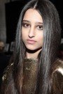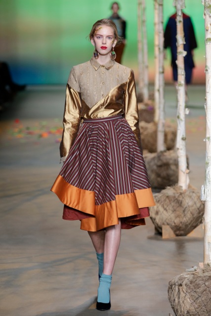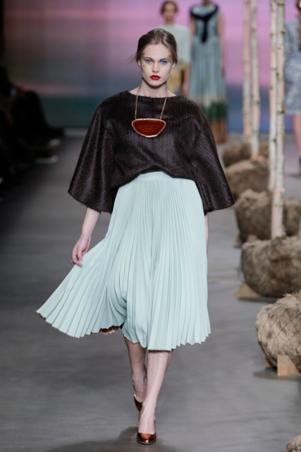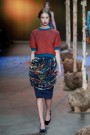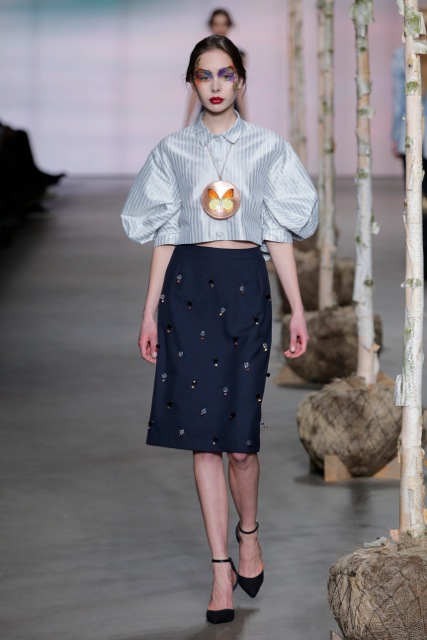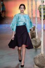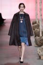 We saw a fur balloon-shaped skirt and tops with puffy sleeves. The models wore snake leather shoes.