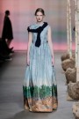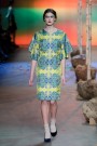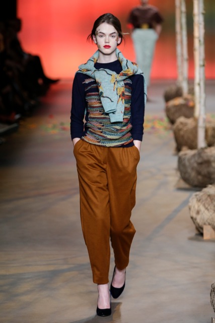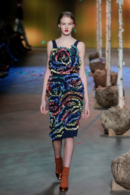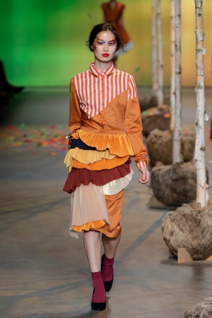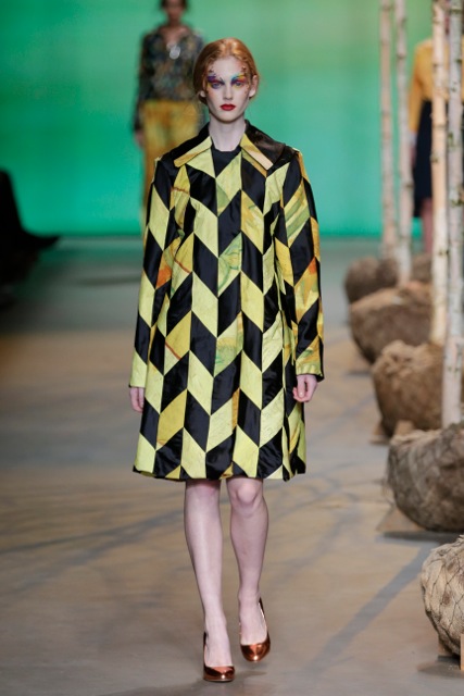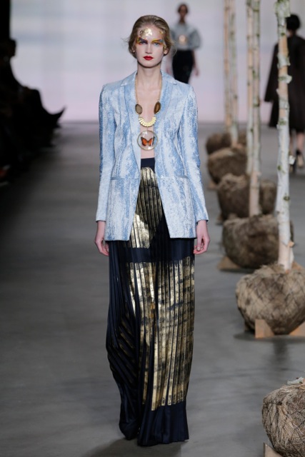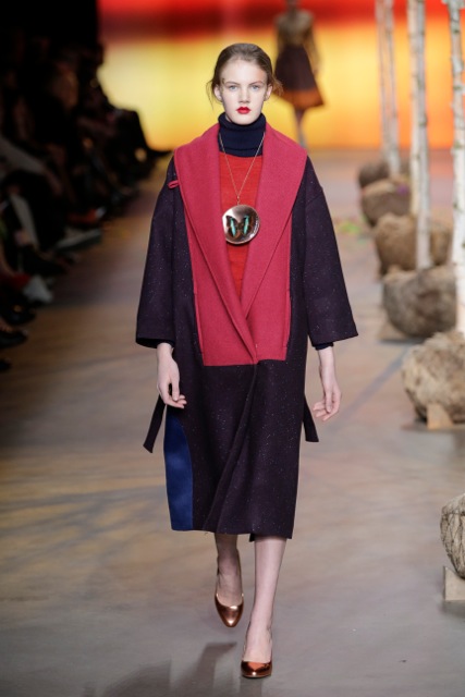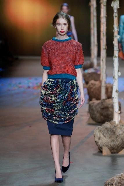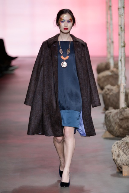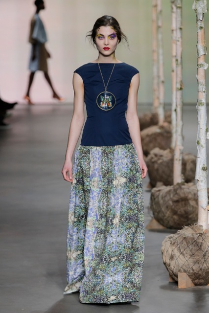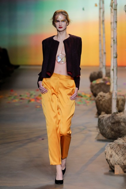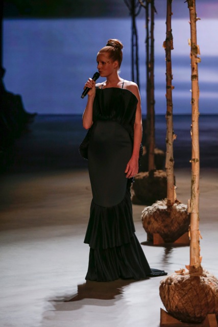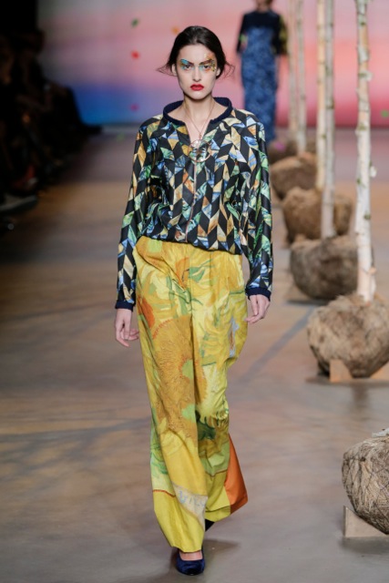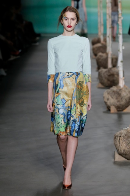 The first edition of the official Mercedes-Benz FashionWeek Amsterdam kicked off with Mattijs van Bergen presenting his fall/winter 2014 collection ‘Complementair’. Dutch (pregnant) actrice and longtime muse of Mattijs Jolanda van Berg opened the show by singing an a capella version of Starry, starry night by Don Mclean. Then from a gorgeous colored backdrop – inspired by Vincent van Gogh’s use of color – Mattijs’ models (with heavy, bright colored make-up on) slowly appeared, trees and falling leaves completed the setting. In collaboration with the Van Gogh museum Mattijs came up with a somewhat romantic, bright colored collection throughout which digital prints of Van Gogh’s work could be seen. On an extravagant, long evening gown or used, literally, as a kaleidoscopic all over print. The Dutch paintings could be seen more abstractly in just the use of colors (from his first dark works till the more explosively colored pieces of art). In between all the art references Mattijs’ signature could be seen, like in pleated skirts and jackets, duo colored pieces with graphic parts, metallic details and butterfly jewelry. New were the knitwear items combined with comfy pleated day-wear pants, which both appeared refreshing and seemed to be perfect commercial assets to Mattijs’ autumn ’14 collection.
