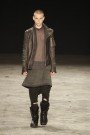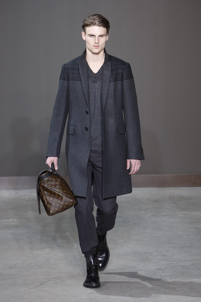 The clothes came in masculine shades like dark gray, black and brown. Paul Helbers designed knitted cardigans and double-breasted, long, woolly coats. As seen in other f/w menswear collections the LV-jackets – as well as his bags – often had leather details. The leather used for some coats almost looked fake, while it had no creases, tears or what-so-ever.