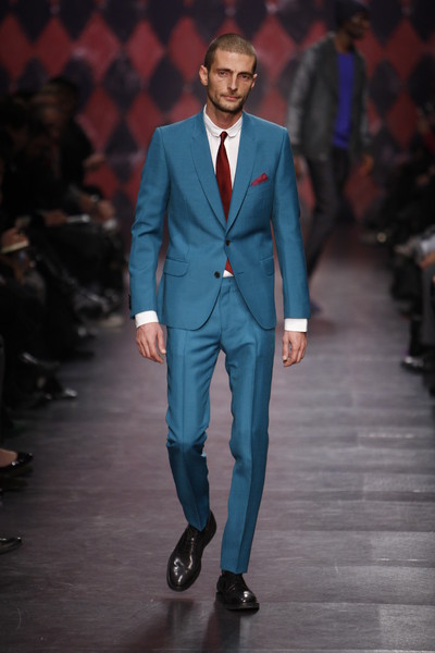 At the menswear fashion shows we spotted lots of suits. Complete suits in one color or just combinations of pants and jackets. The remarkable thing about those pants and jackets was that they were all pretty tight fitting. So the muscular bodies of the models were clearly accentuated.