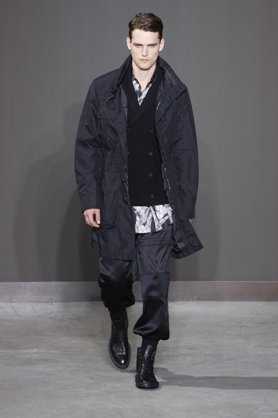 Junya Watanabe reinterpreted the Jazz Age and made it to a fine collection. He gave the tailoring a twist— double-breasted suits illuminated with red stitching — and then meld formal and casual, which has become the season’s major trend. Watanabe made that mix more than putting a nylon parka over a suit or teaming a tailored jacket with jeans. He showed inserts of leather in suits and made the sportswear as powerful as the more formal pieces. The designer also put in another strong story: the revival of the camel coat.