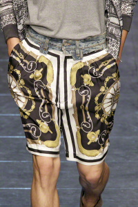 This will become big! Celine was the one to set off with foulard prints last season, with Prada in her footsteps starring panel printed monkeys and bananas. Now time is ripe for a true 80’s Versace revival of loud head to toe decorative foulard patterns as staged by D&G. Brave, bold and baroque. It concludes in a look reminiscent of muscle boys as photographed by Bruce Weber and Herb Ritts in the 80’s.