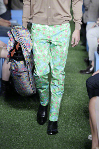 Think American tourists playing golf in the 50s. A touch of Hawaii and American retro with a fun dose of bad taste. Tailored, double-breasted suits mismatch with loud clashing floral printed shirts or pants. Western shirts embellished with rhinestones, recall memories of young Elvis. Prada and Kenzo spice up there ranges with funky, colourful accessories