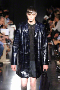 Summer 2011 has just started and we’re already on our way to 2012. Milan menswear-shows brought us some new trends. Not any BIG news really, but shifts in menswear go slowly and rather invisible. Much talked about shows were the Prada-show, with Miucca’s take on golf and all the rules, rituals and codes that belong to that world; the Jil Sander show and Raf Simons’s new black and the Versace-show which looked like an homage to the old Gianni-times. But the seven main trends – besides the wider pants, longer jackets and absence of ties – so far in Milan are the return of sportswear, blue as the new favorite color, bold prints, new checks, tribal-elements, the motor-jacket and the playboy as the new icon.
