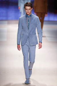 Just like last season, blue is still the rage. And we’re not just meaning blue, but REAL eye catching cobalt blue. It’s one of the strongest and coolest colours for men, but it’s up to you how to dispense it. If you want to go all the way, your permission lays here in Milano. Just ask Salvatore Ferragamo, Valentino, Vivienne Westwood or Dsquared.
