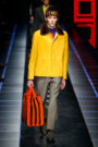 There was a cartoonish feel to the boxy bags — which came in electric pink or screaming yellow, some with fuzzy bobbles dangling off the handles — and to the fur coats that were inset with soccer-fan scarves reading Fantastic Fendi.