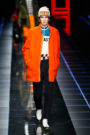 Models marched down two long catwalks in androgynous looks — a leopard-print coat and pink tracksuit trousers worn with furry orange slides, or a dark coat, its fur lapels done in tutti-frutti colors. Contrast, go-faster stripes stretched down the sides of trousers or came as furry strips on jacket arms.