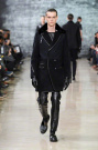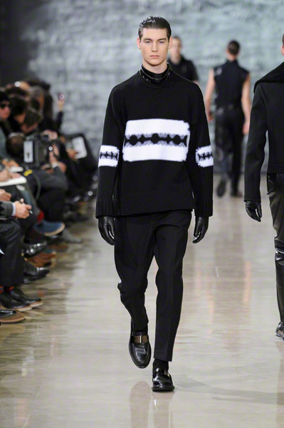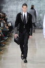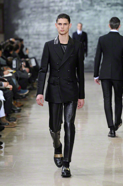 Again black and black leather were in the spotlights of a menswear-collection. Stefano Pilati presented a younger take on chic dressing, with a sexy and agressive edge. His sharp, power suits were toughened up with biker jacket details. The opening tuxedo with peak lapels in gleaming leather was strong. Leather panels added rigor and a hard edge to wool coats, carrot-shaped flannel pants and sweaters. Loafers glinting with metallic straps added a robotic note.
