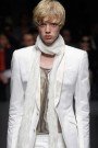The menswear collection of designers Tommaso Aquilano and Roberto Rimondi for Ferré was inspired by the 70’s movie The day of the Jackal. That meant sleek, elongated suits with small lapels, sailor tops and clerical collars. There were some technofabrics like rubberized suede and neoprene-ed leather together with silky woven cotton and white denim for a smoking jacket.