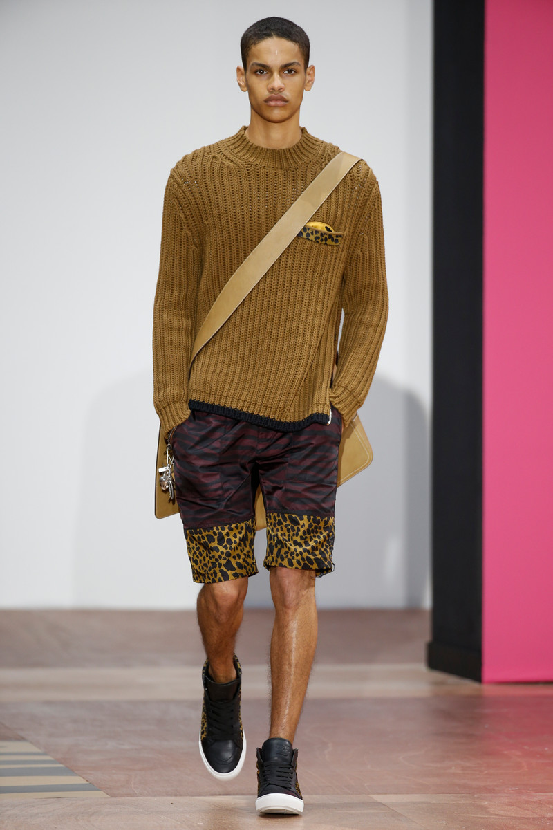 When it comes to hemlines in the womenswear department they seem to change a bit every year; rising and dropping in line with the latest trends. This year menswear shorts are doing the same thing. Hemlines are dropping and long shorts seem to dominate the SS2016 menswear image. Balmain, Armani and Dsquared are just a few of the brands covering the longer short for summer. Yet the fact that they’re all at knee length might be just about the one thing those shorts have in common. Animal printed (Coach), bright pink (Dsquared), double layered (Balmain), baby blue and 7/8 (Emporio Armani); more is a bore doesn’t apply here. They came in heavy; leather look (and some palmtrees) at Dsquared and suede at Fendi, silky: at Philip Lim and Dolce & Gabbana, sophisticated; Gucci and Jil Sander and ultra casual; Long and Kenzo. Proof that you can go either way with this year’s summer short. Whether office ready or beach bound; any man should be able to smoothly work the short into this season’s wardrobe. And most importantly: have a little fun while he’s at it. Donatella Versace is showing just how that is done, sending out her male models in head to toe lilac looks, shorts worn over trousers. Out of the box, indeed!