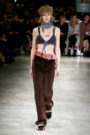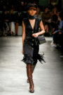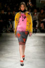 Miucca Prada still believes in style as a mighty power to fight for women’s rights. She took traditional trappings of glamour — feathers and embroidery — and lavished them on everyday staples: pencil skirts, cardigans, tailored jackets, bear-hug outerwear, a chemise here and there. Often, these came in weighty fabrics — corduroy, thick knits, tweeds, shearling — put together in audacious collages of color and pattern, atop heels fastened with giant buttons or big, furry multicolored mukluks. Orangey tweed and leather jacket over bright yellow skirt with red embroidery and blue white feather hem? Cocktail dress with feathered bonnet? Prints done in collaboration with artist Robert McGinnis? Whatever their politics, fashion ladies will succumb to the seduction.