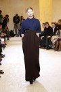 As always Giorgio Armani is choosing his own direction when it comes to fashiontrends. For him no fancy colors, no Mod-style, no dressing up at his Emporio Armani-collection. Instead he plays his well-know play with fabrics, textures, black and white. He got inspired by a film noir, where beauty is concealed behind a pair of dark glasses and under a hat. This resulted into a total black collection, with flashes of white and blue. There were jumpsuits, sharp cut full trousers and sculpted jackets. The silhouette was long and fluid with raw-edge finishes, fabrics were matt, velvety and mongolian fur added a touch of luxury.