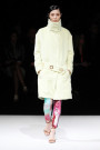 Just Cavalli in general went for the hairy fluff, but here he wrapped his model in snug short shearling in a pretty pale pastel. At Fendi zippered skirts and parka’s, sporty as well as romantic, with tufts of fur on luxurious casual coats. And also Gucci tapped into the casual side of its heritage, with smart double-breasted coats, short high-waisted dresses in sugary macaron-shaded and faded pastels. To quote Suzy Menkes for NYTimes: ‘All good and luxurious stuff’.
