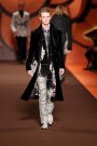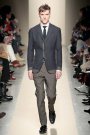 In a season of mixed materials, Tomas Maier lightly applied tonal accents and contrasts, like glistening patches that looked like plastic tape. Fabrics were rich and warm, yet ultra light. Flocked velvet dripped from the V-neck of a black cashmere sweater; black cashmere-velvet pads capped the shoulders of short jackets and rubber details gave wool coats an urban touch.