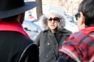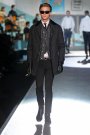 Dressed in severe coats reminding of Eastern Bloc military dress, the models and actors Willem Dafoe, Tim Roth, Adrien Brody and Gary Oldman walked a massive, carpeted space. The first outfit set a military tone: a smart dark coat over a white turtleneck, slim pants and gleaming dress shoes. Belted coats in lightweight wool played a major part and they were often decorated with badges over the heart. Colors were of course a bit off beat, mustard, purple, grey and black – and the fabrics looked vintage.