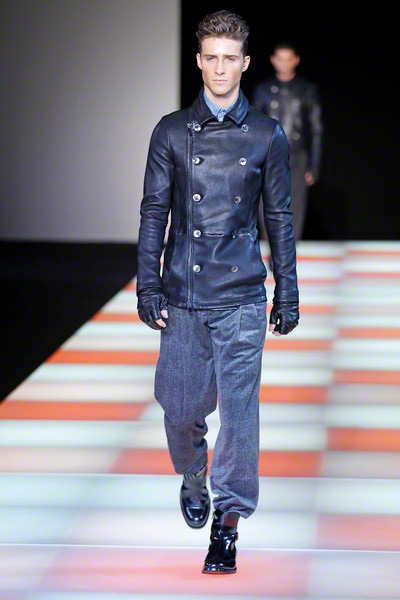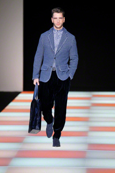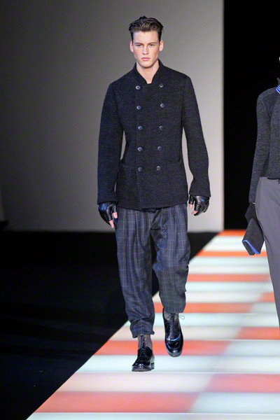 In Milan traditional men’s wear fabrics such as tweed, herringbone and plaids were dominating the fall-collections, and Giorgio Armani is no exception. The designer presented a masculine but soft-edged collection, with knitted wool, stretchy fabrics, velvet, corduroy and leather. Knitwear was also used as outerwear in double-breasted coats with patch pockets and short jackets with high, zippered necks.