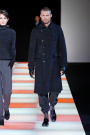 Dressed in severe coats reminding of Eastern Bloc military dress, the models and actors Willem Dafoe, Tim Roth, Adrien Brody and Gary Oldman walked a massive, carpeted space. The first outfit set a military tone: a smart dark coat over a white turtleneck, slim pants and gleaming dress shoes. Belted coats in lightweight wool played a major part and they were often decorated with badges over the heart. Colors were of course a bit off beat, mustard, purple, grey and black – and the fabrics looked vintage.