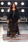 The sharp look of a sleeveless leather safari jacket was softened by fluid baggy pants. There were also deconstructed tailored suits with loose shoulders.