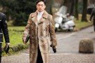 While bomber and biker jackets were shorts and fitted, overcoats in fur and camel were oversize. And if you thought all that heavy shiny leather and hairy fur might be a little too extreme for our soft winters; Donatella added a few more airy looks to her collection too. Like sheer embroidered bodysuits with lace details and the baroque Versace swirls worn with black tuxedo jackets.