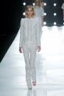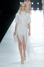 This ss 2013 collection looked like a Cavalli in a calm, almost Zen mode. Instead of all sex appeal it was pure elegance and modernity. The show opened with a group of white looks in a clean silhouette with tailored jackets, crisp shirts and flared pants with extravagant treatments, like draped fringe and leather that was laser-cut and embroidered to look like lace. Prints were shown mostly in black and white, with a few muted neons.