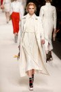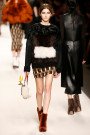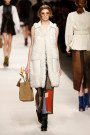 The fabric splicing intrigued — the simplicity of the two-tone white coat that opened the show to graphically collaged coats and a witty felt gilet over corduroy pants wrapped in tubes of shearling from the knees down. The diversity continued through to silhouettes; looks came long and lean, long and swingy, short and crisp, and big, bigger, biggest, with the mega-statement coming on the big side. Lagerfeld and Fendi did outrageous takes on the puffer, including out-to-there short jackets over slim skirts and some strapless dresses.